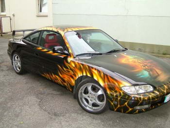 Christian Lohmann Seinerzeit habe ich 1500 Euro für die Lackierung bezahlt, das ist etwa ein halbes Jahr her. Der Wagen ist Baujahr 1996 und hat 190PS unter der Haube. Es sind zwei Königssitze eingebaut und 17 Zoll Felgen mit 215ner Bereifung. Der Wagen ist noch nicht ganz fertig, mir fehlt noch ein grosser Heckflügel, eine breite Frontschürtze. Die Lackierung wird auch noch erweitert. |